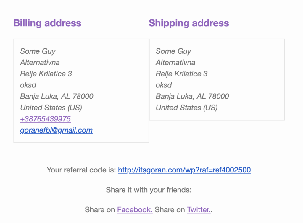 Once you add this code, the referral link should be shown at the bottom of every order email, as shown in the image below.