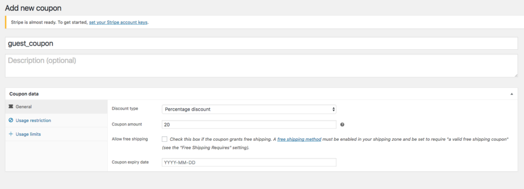 2. Match the settings to those on the screenshot below (click to zoom in). Add a name to the coupon (I named it guest_coupon), make the type percentage discount, and add a coupon amount: