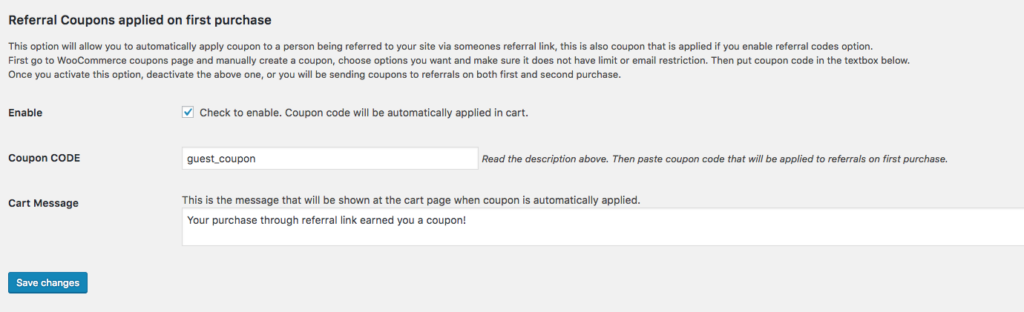 3. Go to Plugins settings ( WooCommerce -> Settings -> Refer a friend tab), then go to Referred person coupon settings tab, and at the bottom of that tab match the settings to the screenshot below:
