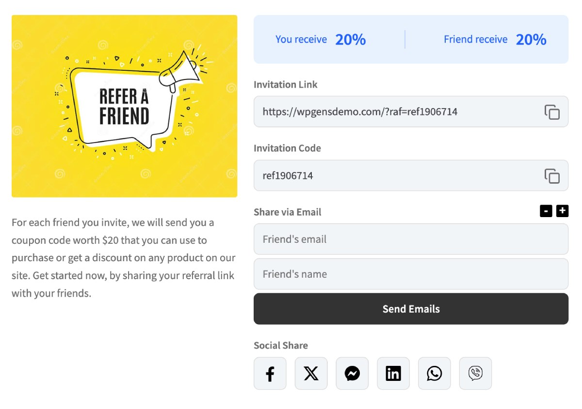 WooCommerce Refer a Friend supports 2 types of shortcodes you can use to show a referral link to your customers: