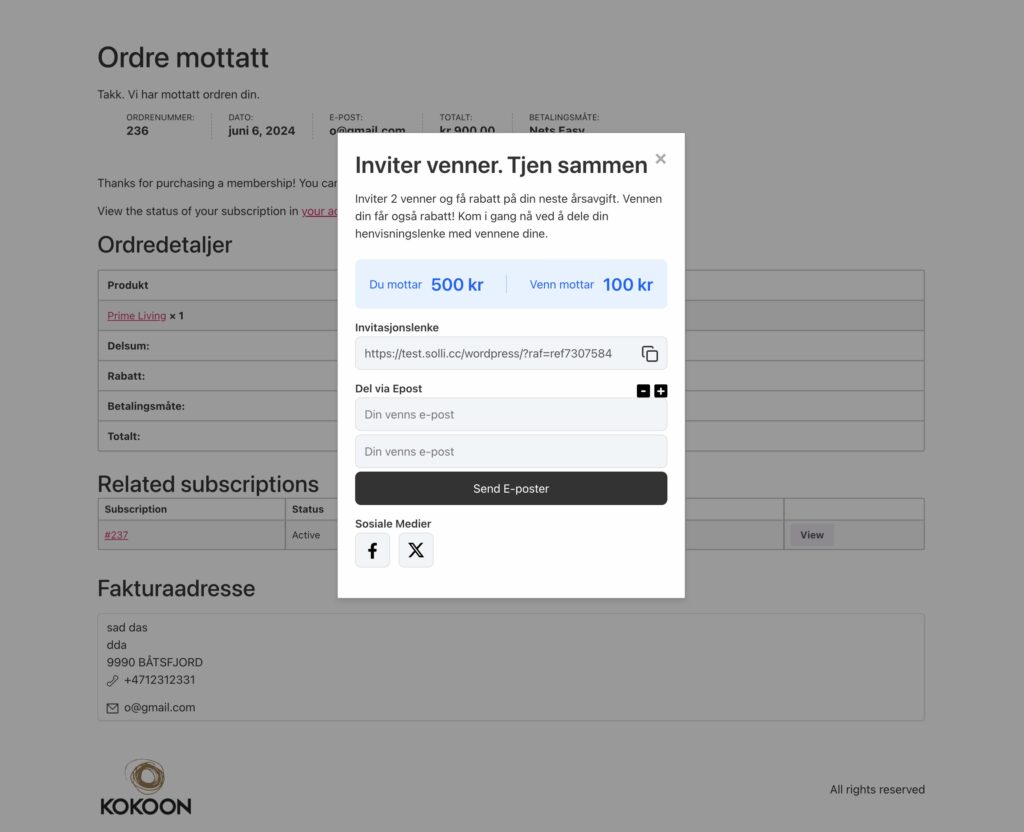 If you want to show customers a referral link with a social sharing option on the Thank you page after they make an order, under displays settings, turn on the option to show the referral code on the thank you page, and also turn on the option to show within the modal. If you are using an older version of the plugin, before version 4.1.0, you can update a plugin or add a snippet from below.